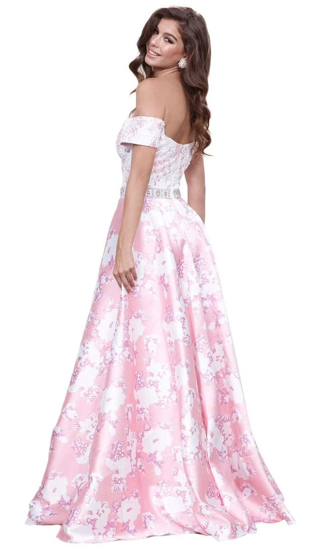 Classy and refreshing, bloom with loveliness in this detailed Nox Anabel 8301 creation. Featuring an off-shoulder bodice of lace details, this beauty shows off an embellished waistband. The full A-line skirt traverses to the ground in subtle floral print. This gorgeous Nox Anabel masterpiece will let you celebrate that divine feminine beauty!
