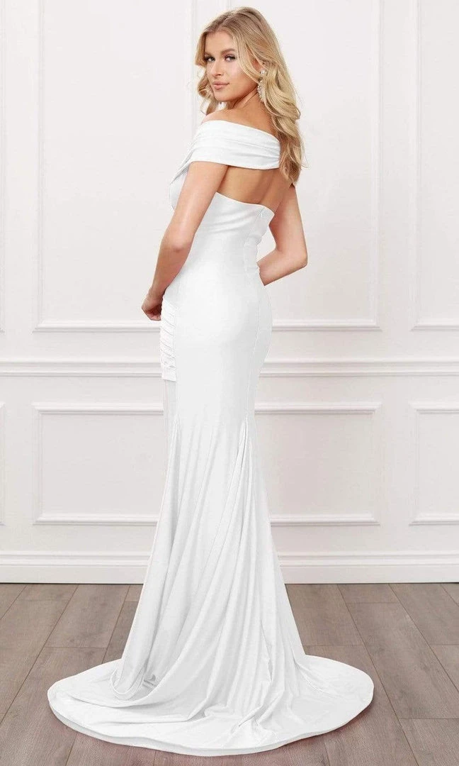 Appeal with your relaxing elegance in this magnificently styled special occasion gown by Nox Anabel E497. Fabulous long sleek gown showcasing a pleated off-shoulder sweetheart neckline, with short sleeves and features a cutout back. The bodice is tailored with a comfortable stretch fit with soft pleats to accentuate a flattering figure while the skirt fits and flares to full hem with a gorgeous pool of train. Fascinate everyone with the romance of this perfectly designed Nox Anabel.