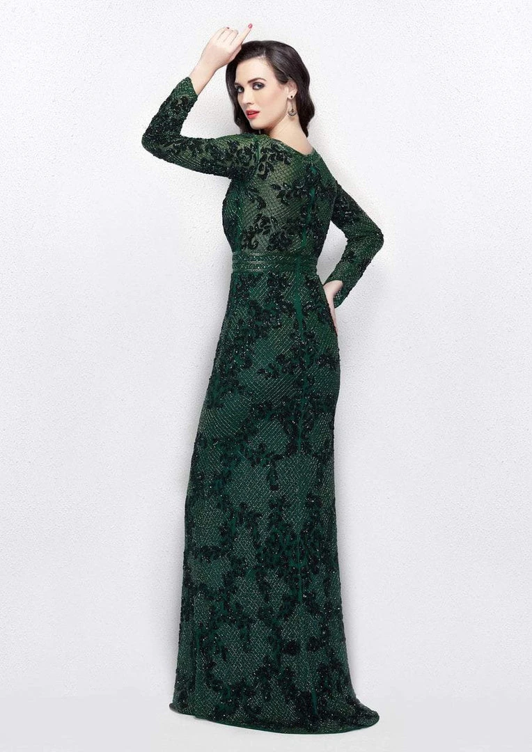Get glamorous look with this dress by Primavera Couture 1990. This alluring dress features a long sleeved and noticeable plunging V-neckline. Glittering beads outline the neckline and the fitted bodice is dazzled with a sparkling sequins all over. Be in this gorgeous Primavera Couture creation and leave a lasting impression.