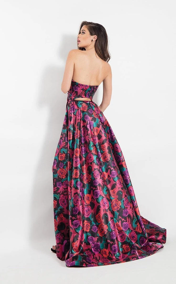 Be the epitome of sophistication in this evening gown by Rachel Allan 6006. This strapless formal gown showcases an A-line silhouette in floral print stretch satin. The bodice boasts with a V-notched neckline with asymmetrically ruched details that segues to a full-length skirt. The lower back peek-a-boo cutout offsets the high slit skirt with sweep train. Truly this creation by Rachel Allan is the definition of chic and classiness.