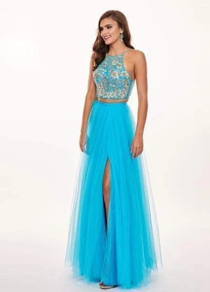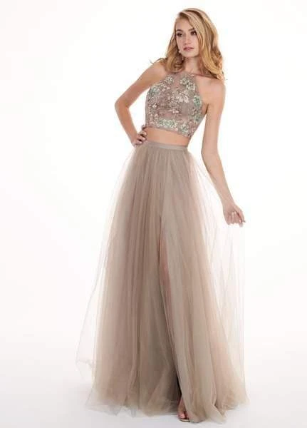 Pretty and darling is this style right here from Rachel Allan 6596. This prom gown has an embroidered top with a bow made of mesh on the back, while the skirt is soft tulle with a slit running along the front of the gown. Waltz into the party looking fabulous in this Rachel Allan style.