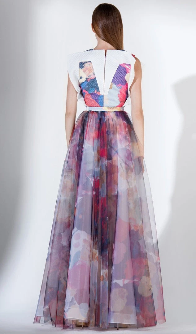 Enter the party and do that walk of a regal beauty in Saiid Kobeisy 3431. This sleeveless multicolored brocade dress gallants in a V-neckline with bodice cinched in a thin band. The back has a zipper closure and from the waist flourishes a floor length A-line skirt made of tulle fabric. Be ready to mesmerize the night in this Saiid Kobeisy design
