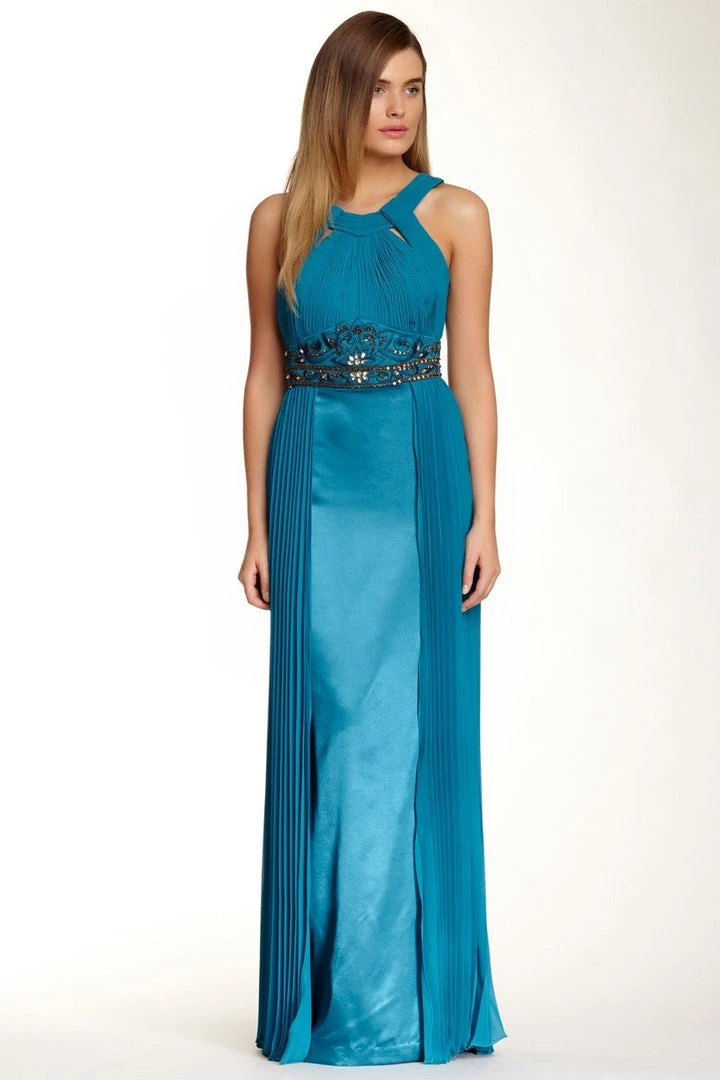 | Details: | Sleeveless, Satin, Accordion Pleats, Ruched Bands, Cutout Accents, Embroidered Empire Waist, Shirred Overskirt, Side Zipper, Full Length Hem |