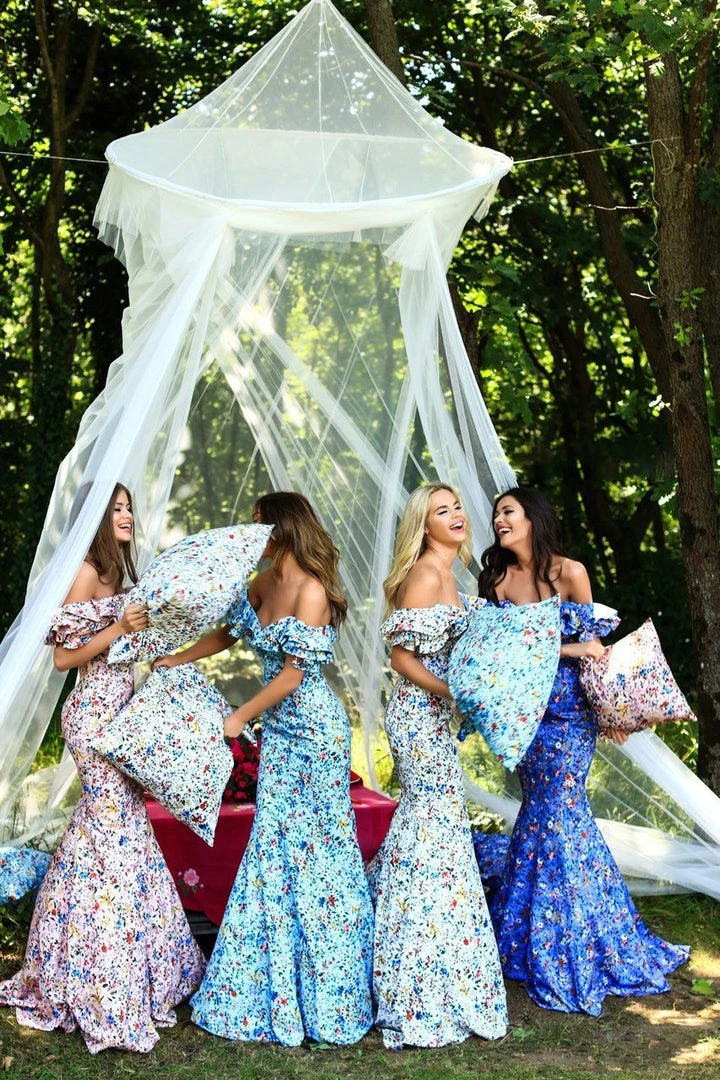| Details: | Printed Taffeta fabric, Floral print bodice, Mermaid skirt, Ruffled details, Off shoulder sleeves, V-shaped bodice, Floor length |