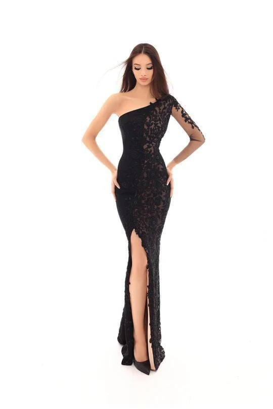 Channel extravagance in this evening dress by Tarik Ediz 93614. Features an asymmetric neckline with sheer long sleeves. The fitted bodice is adorned with embellishments and flourishes a full length trumpet skirt wit islit and sweep train. Get ready to show off your glamorous side in Tarik Ediz. Model is wearing Black color. Find more evening dresses!