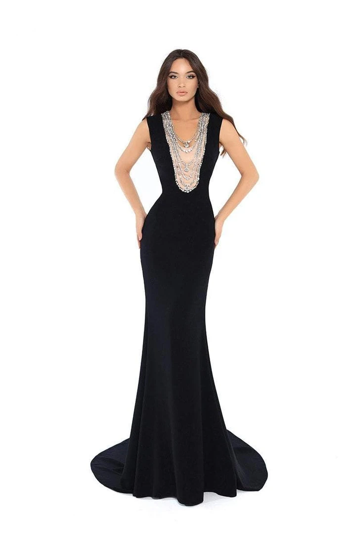 Strike a pose in this simple yet captivating evening dress by Tarik Ediz 93744. Bead embellishments beautify the sheer scoop neckline for a sparkling effect. Fitted through the waist and hips, the sheath skirt flares gorgeously to the floor finished with a stunning sweep train. This fabulous design by Tarik Ediz is certain to bring you an unforgettable moment. Model is wearing Black color.