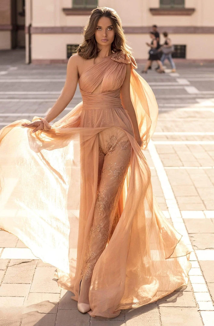 | Details: | Chiffon , Ruched Bodice and Waist, Front Cutout, Beaded Lace Pants, Floor Length, Side Zipper Closure, Sweep Train |