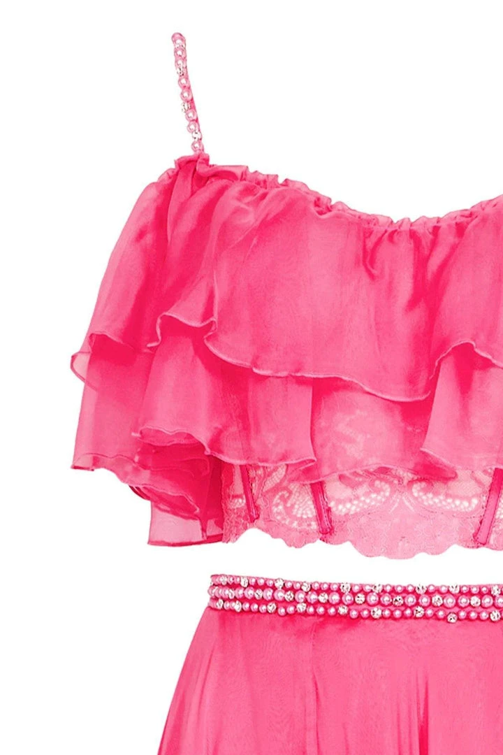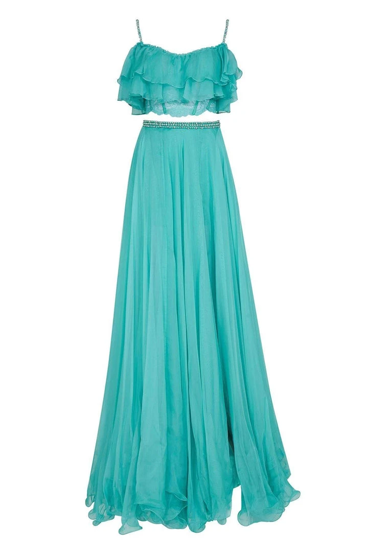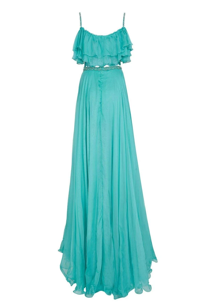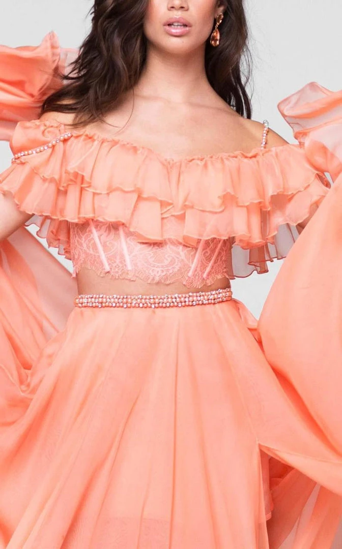 Turn yourself into a head-turning beauty by slipping into this absolutely eye-catching airy formal set by Tarik Ediz 50064. Features beaded straps and an off-the-shoulder neckline with tiers of sheer ruffles that accent the bust and cropped lace midriff. The waist is accentuated with strands of sparkling beads. A side split provides a sumptuous accent along the full-length. Be ready to capture the spirit of that romantic evening in Tarik Ediz. Model is wearing Peach Nectar color.