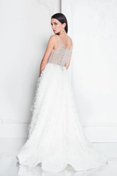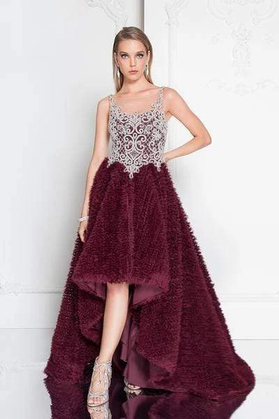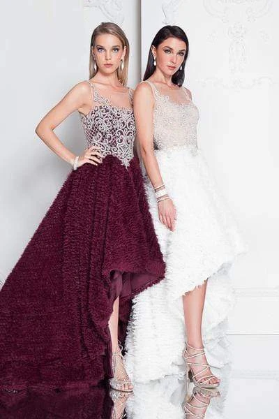 Steal the show when you walk in in this exceptional Terani Couture 1811P5796 creation. Beautifully crusted with silver beadwork designed in a scroll and lattice motif, this enticing piece shows an illusion bateau over a sweetheart neckline. Mimicking the embellishments of the bodice, the illusion scoop back is ornamented with beadwork as well as its basque details. The A-line skirt is adorned with shirred chiffon that softly flares down into a high low hemline and a sweeping train. Win over the hearts of many in this charming Terani Couture masterpiece.