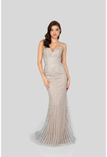 Look stunningly beautiful in this captivating evening gown by Terani Couture 1912P8225. A pronounced sweetheart neckline frames the fitted bodice supported by double beaded straps. The open back bares enough skin to make it more flattering. Linear beading makes a dramatic hour glass silhouette as it falls down to full length finished with a sweep train. Light up every room in this sparkling prom dress from Terani Couture design. Model is wearing Silver color.