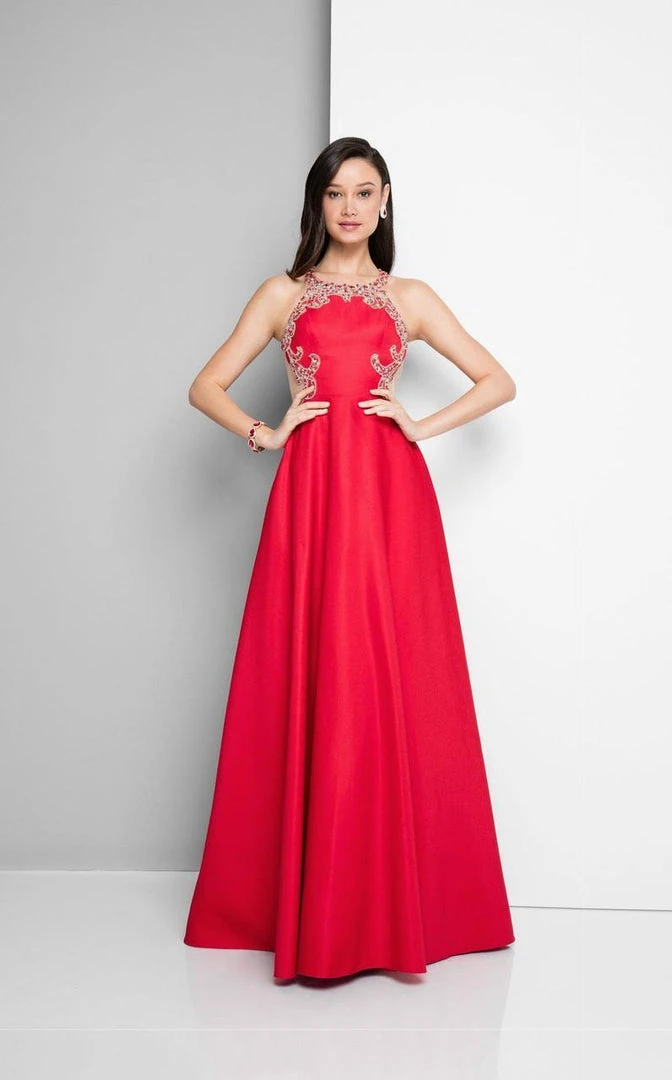 Get ready for everyone to stop and stare when you show up in this Terani Couture 1712P2887. Crystal beaded ornate scrolls adorn the fresh neckline of this matte mikado red carpet ready ball gown from our prom collection. This special occasion dress is the perfect dress for prom, features a nude illusion insets and back decollete to the waist. This enchanting Terani Couture is sure to make you the center of everyone’s attention