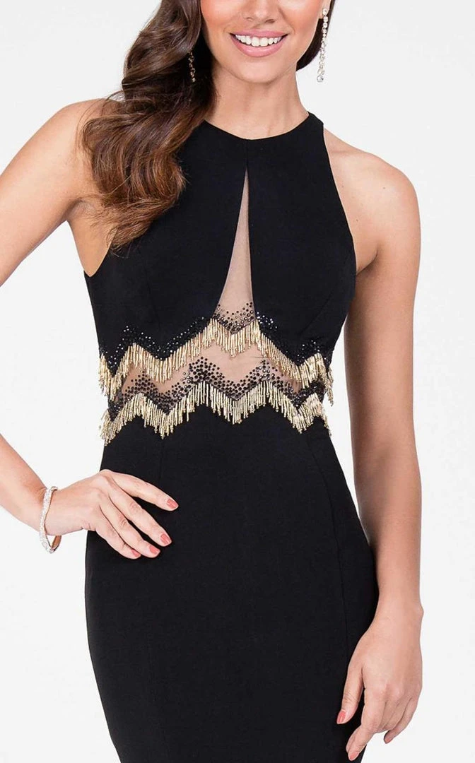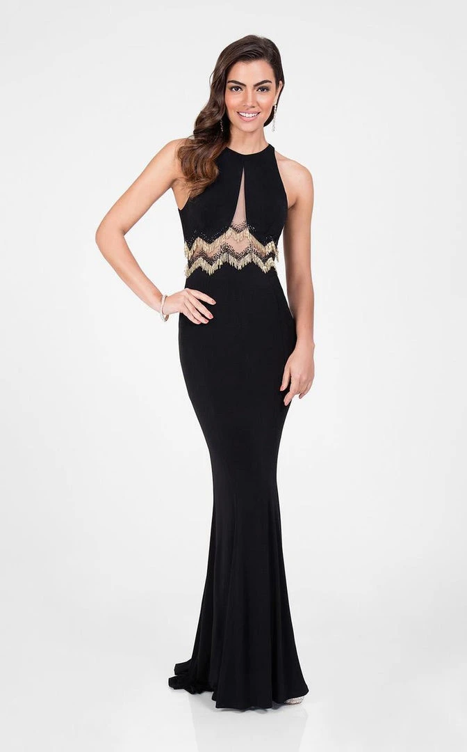 Get ready to be captured in picture of sophistication in this dress by Terani Couture 1715P2988. Black jersey red carpet ready mermaid floor length designer dress for prom with sheer mesh insets. This dazzling special occasion dress from our prom collection includes gold & jet black beaded fringe and rhinestones that create a Zig-Zag pattern detail. Be at your most elegant night in Terani Couture.