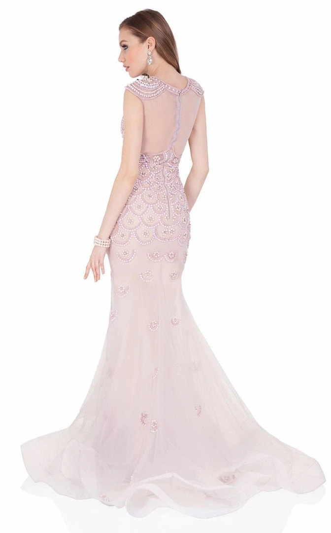 Promote attention-grabbing style in this stunning Terani 1622GL1982 gown. Splendidly embellished evening gown featuring an overlapping scallop beaded motif. Round neckline, cap sleeves and sheer back. The fitted silhouette opens up to a lush mermaid bottom with brush train. Terani Couture is perfect for standout style and flawless fit.