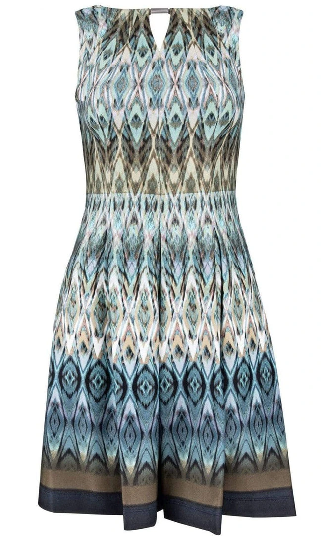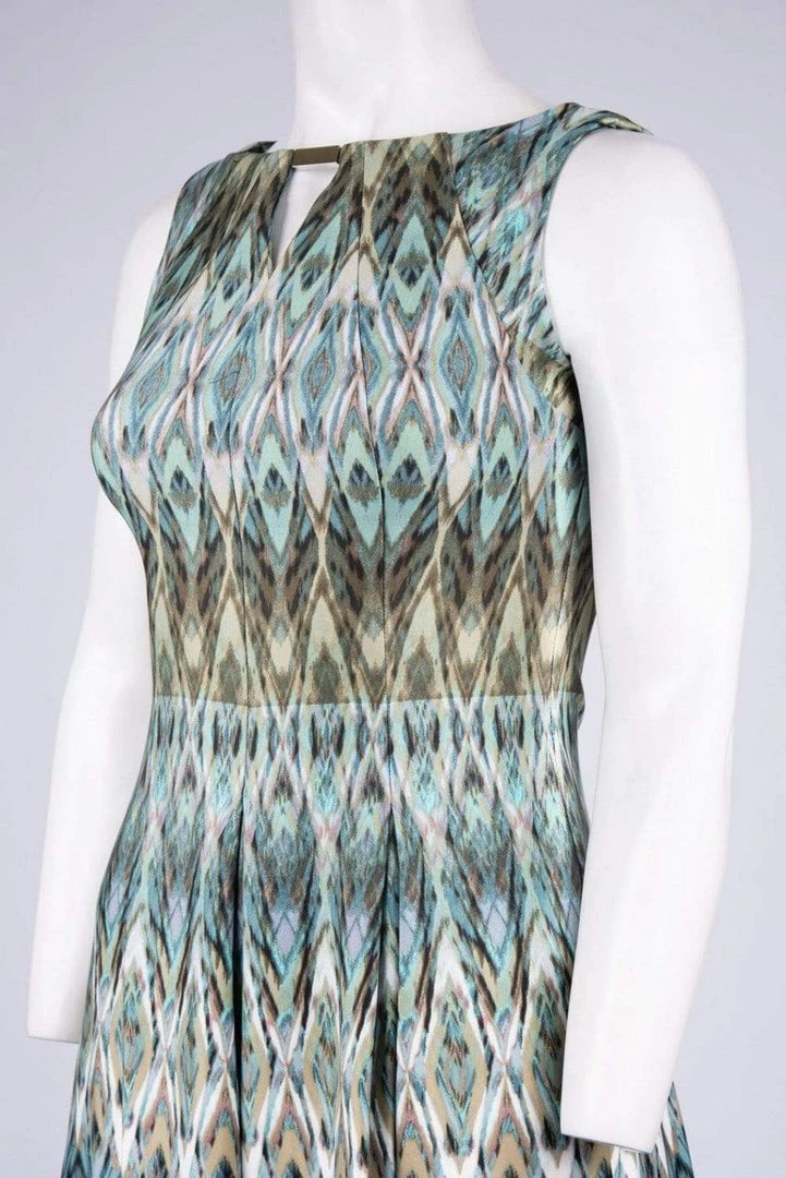 Feel glamourous in this Gabby Skye 18986M. The multi-print design dress features a sleeveless, bateau neckline with keyhole detail, and an A-line skirt. Back zipper closure. A sure winner from Gabby Skye creation!