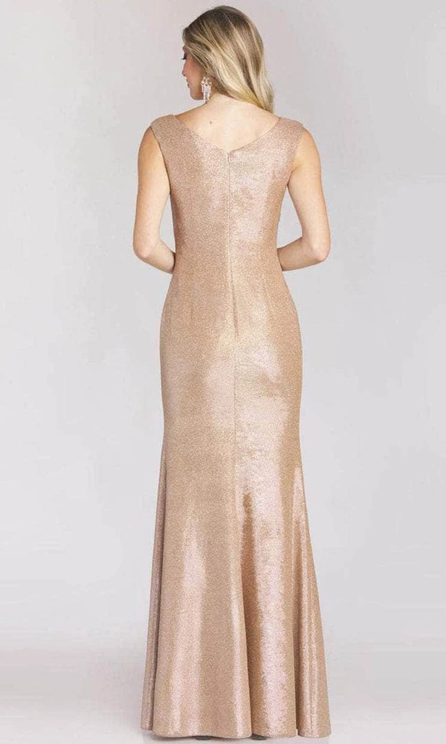 Brave the evening with temptress beauty and grace wearing Gia Franco 12207 masterpiece. This exquisite gown features a sleeveless, fitted bodice with a V neckline, cap sleeves, and mocked in the back with a V-shaped cut. A ruching detail on the waist with a bow accent adds allure to your look. The skirt falls down to the full-length hem, featuring a sheath silhouette with a thigh-high slit for a fascinating appeal. Mesmerize the crowd with your sophisticated flair in this Gia Franco creation. Models are wearing the Rose Gold and Royal colors.