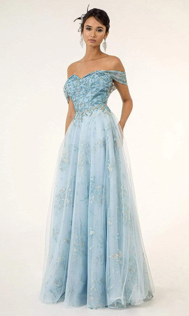 Make them look in this lavish gown by GLS by Gloria GL1922. Adorned with trailing glitter print, this mesh gown features an off-shoulder neckline with a sweetheart notch, princess seam fitted front bodice, while the back showcases a sheer corset inspired style with lace-up details. The A-line skirt cascades into full-length with a sheer layer for added dimension. Have an enchanted evening at the ball in this gorgeous gown by GLS by Gloria.