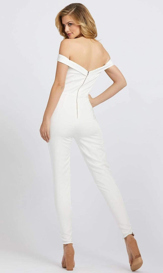 Get noticed in any crowd wearing this one of a kind look from Ieena Duggal 26141. Fashions a plunging off the shoulder neckline with a form-fitting bodice. The back is designed with a visible zipper while the bottom is styled with a pair of long fitted pants. Another great creation by Ieena Duggal. Model is wearing this dress in White color.