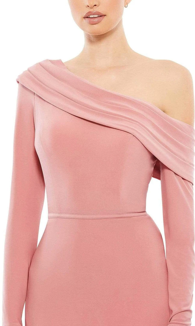 Orchestrate a spectacular evening of dazzling sophistication in this luxurious Mac Duggal 26595. Flatter your finest assets in this crepe-made evening dress. It has minimalist style as it has no embellishments allover but features a pleated asymmetrical neckline on a fit bodice. It uses long sleeves and a wondrous sheath silhouette in full length with a train. This Mac Duggal design is sure to bring you an unforgettable romantic evening!