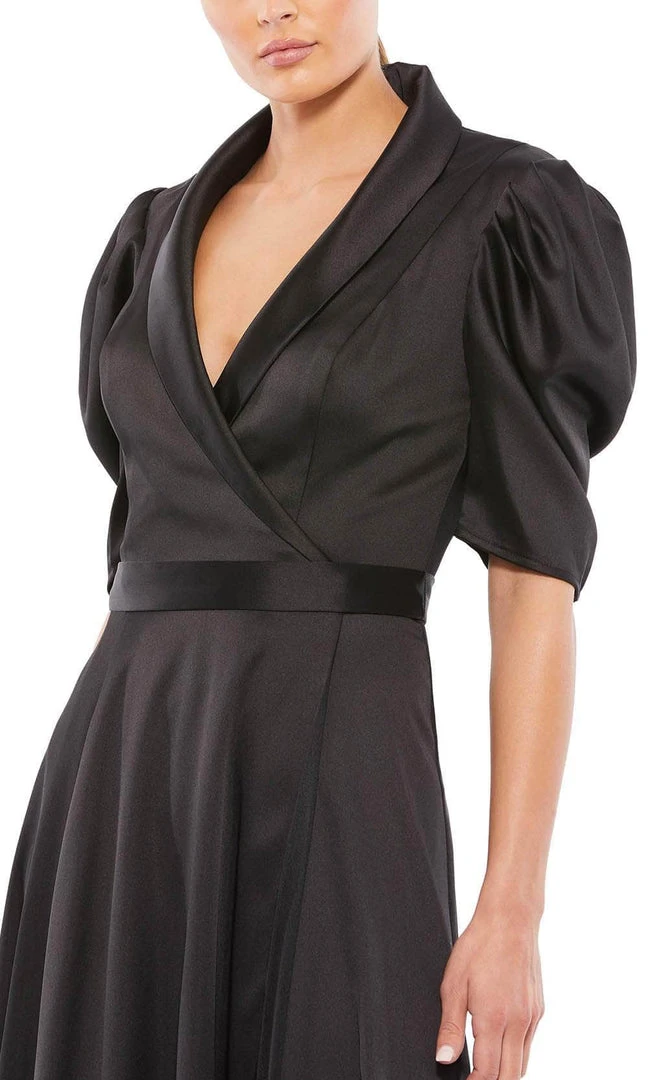Envision the ideal evening in this evocative formal dress by Ieena Duggal 26628. This elegant piece displays a faux-wrap style bodice with an elbow puffed sleeve and satin collared V neckline. The waist is accented with a satin wide waistband while the fully enclosed back is secured by a zipper closure. This pleated A-line skirt flourishes a tea-length hemline. Fall in love when you slip on this Ieena Duggal creation. Model is wearing the Black color.
