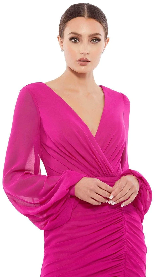 Reveal an elegance that is irresistibly feminine in this dress by Ieena Duggal 26655. With a surplice V-neck and sheer bishop sleeves, it has a fitted silhouette in luxurious chiffon. This tulip hemmed cocktail dress features fine ruching for a unique look. Showcase a memorable and sparkling glamour in this Ieena Duggal design. Exquisite attention to detail is the hallmark of Mac Duggal dresses. Mac Duggal dresses encapsulate the very essence of the women who wear them, reflecting their confidence, feminine power, and inner beauty. Models are wearing Hot Pink and White colors.
