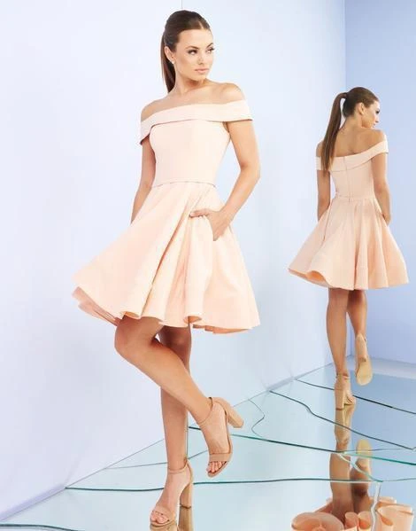 Show off your sweet side in this short cocktail dress by Ieena Duggal 48774. This pretty fit and flare dress showcases an off the shoulder neckline and princess seam lined bodice. Playful pleats emerges from the skirts natural waistline, and forms a voluminous A-line skirt. The dress finishes at above the knee length with horsehair hem. Radiate class and poise as you dance all night long in this timeless Ieena Duggal short party dress.
