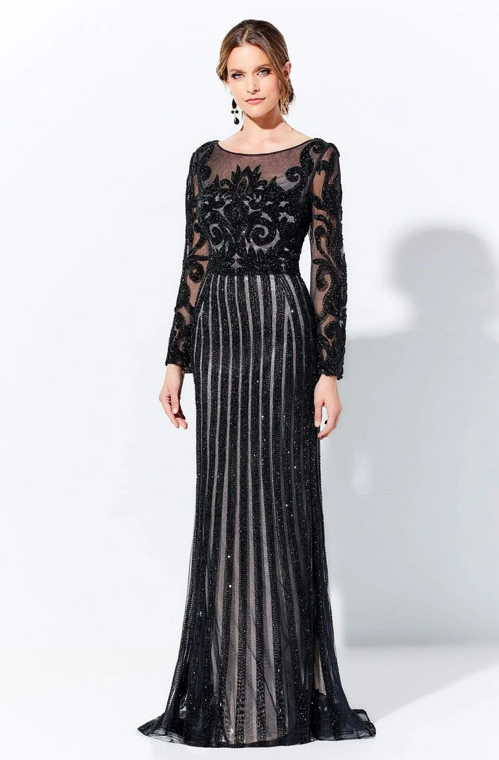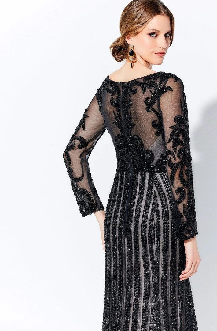 Look totally amazing in this shimmering Ivonne D by Mon Cheri 120D11 evening dress. An illusion wide scoop neckline and slender sheer long sleeves frame the fitted bodice, complemented with sheer full zipped up back. The whole dress is designed in lace embroideries with stone accents which provide the shimmering effect. The skirt features a sheath silhouette which exquisitely falls to a full length hemline, completed with a sweep train. Be the center of attention in this glamorous Ivonne D by Mon Cheri ensemble. Find more mother of the bride dresses!