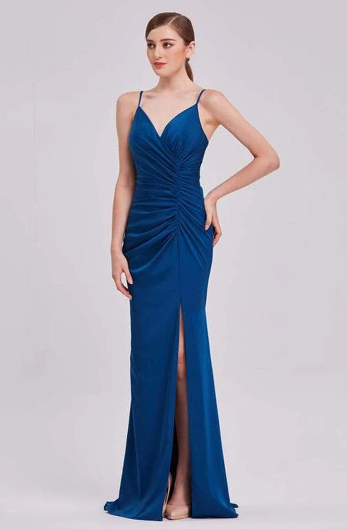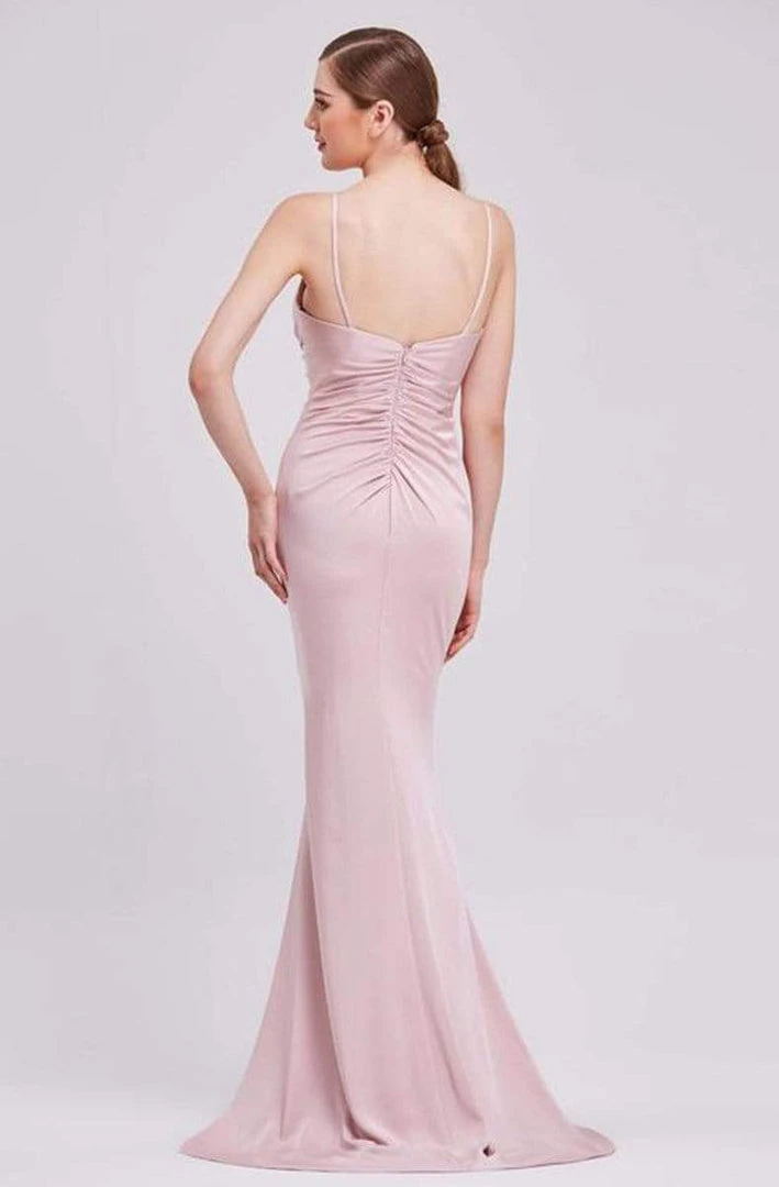 | Details: | Sleeveless, Spaghetti Straps, Surplice Bodice, Asymmetrical Ruching, Shirred Mid-Open Back, Back Zipper Closure, High Slit, Sweep Train |