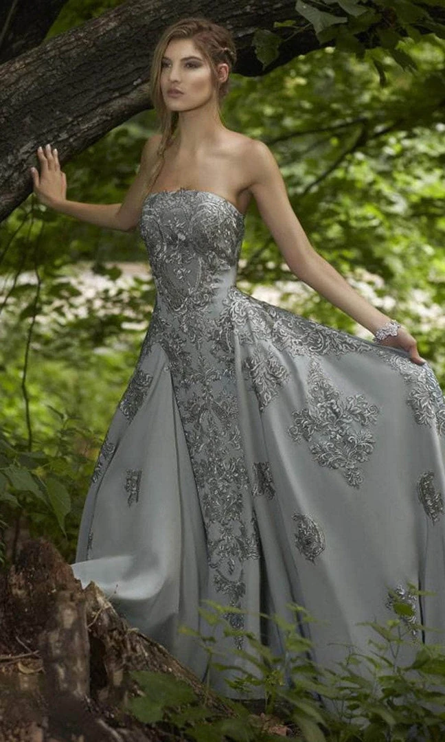 Get that royal look with this evening gown by Janique W1691. This princess-like dress presents a strapless straight across neckline with a bodice richly decked with embroidery. The full-length A-line skirt has a dramatic flair that gives this Janique gown a graceful silhouette. Model is shown wearing Platinum color
