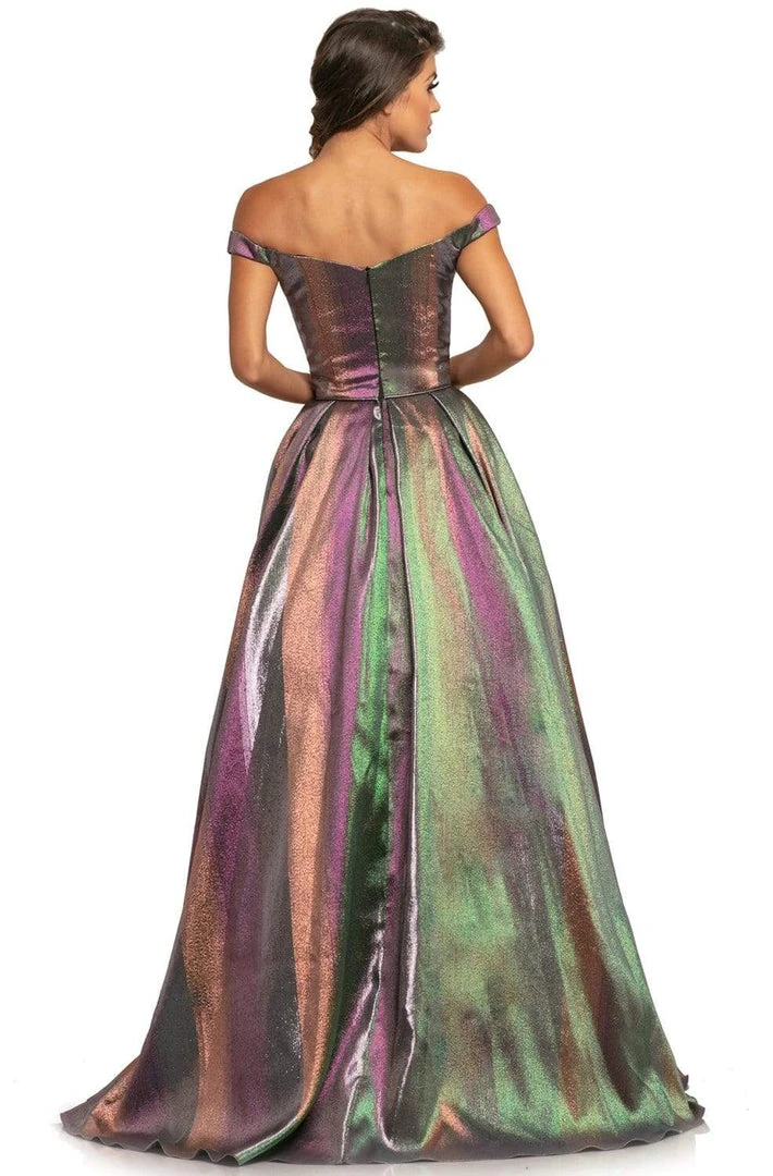 Get the party started in this spectacular evening look from Johnathan Kayne 2019. Makes a statement in a plunging off-shoulder neckline with a fitted bodice. Designed with ombre effect, the gown flourishes a ballgown skirt with a sweep train finish. You are sure to turn heads in this Johnathan Kayne dress.