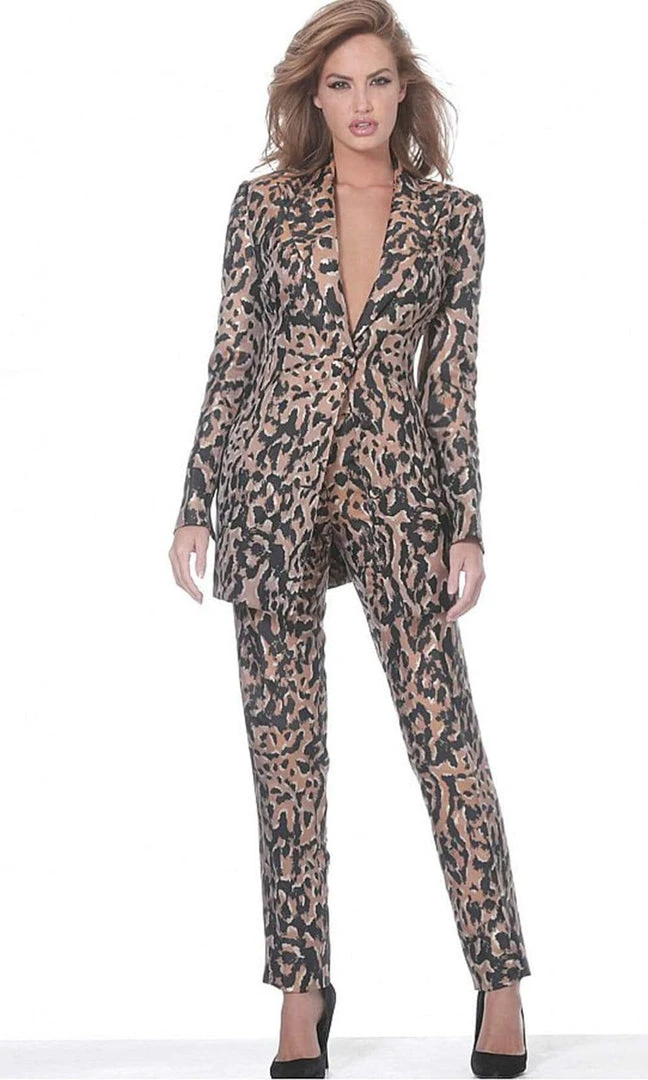 Flaunt a style that reveals a gorgeous and tailored style in this Jovani 03840 creation. Tailored with a long sleeve jacket in an animal print design, this ensemble shows a deep v-neckline with lapels and a single breasted style. The matching trousers shows a fitted style. Standout and dominate everyone’s attention in this Jovani masterpiece.