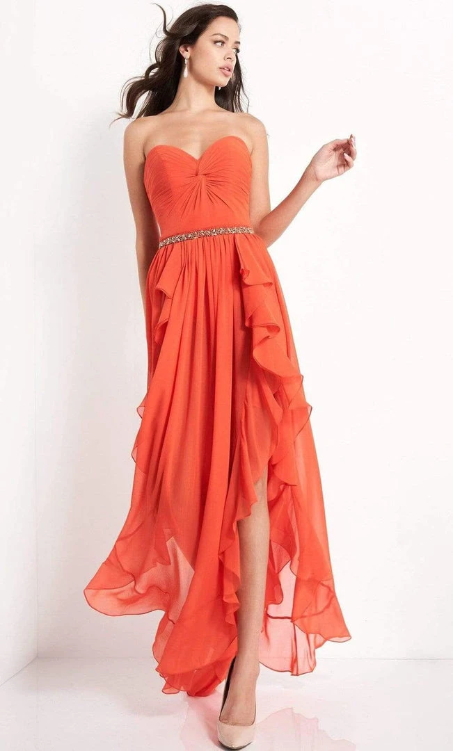 Steal the show in this darling dress by Jovani 04874. A vibrant chiffon dress features a strapless, sweetheart neckline with ruched knotted bodice and mid-open back. The high low skirt flows in gathers with ruffle trim and reveals a high leg slit. This Jovani dress is a sure attention grabber! Model represents the dress in Orange color.