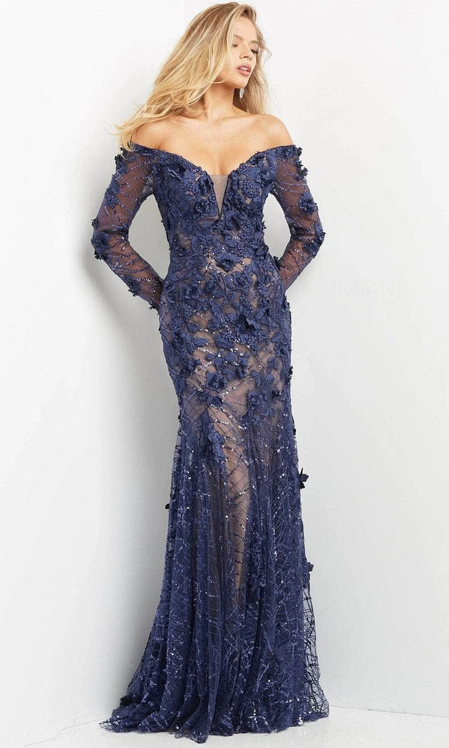 Enter the hall with grace and beauty in Jovani 06635 masterpiece. The fitted bodice is beautifully embellished with embroidery, beadwork and floral lace appliques. It features an off shoulder, plunging V neckline and illusion long sleeve complemented with a mid-open back. The skirt gracefully cascades into a full-length trumpet silhouette that finishes beautifully with a godets detail and sweep train. Celebrate the journey to forever as you saunter with gorgeous sophistication in this Jovani creation. Model is wearing the Navy color.