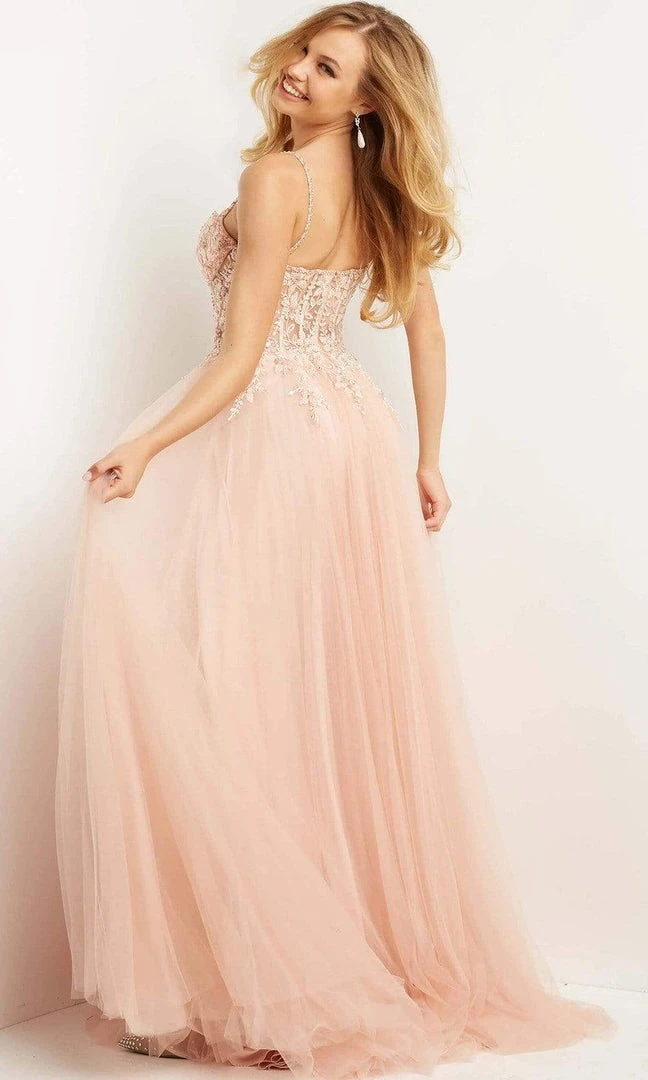 Look lovely and immaculately feminine in this Jovani 07259 creation. Flourishing embellishments in florals and beadwork, this gown charms with a sweetheart neckline and spaghetti straps. Crafted with a sheer corset boned bodice and a midrise back, the tulle skirt opens with a high slit and ends with a train. Explore a whole new style in this romantic Jovani masterpiece. Model is wearing the Blush color.