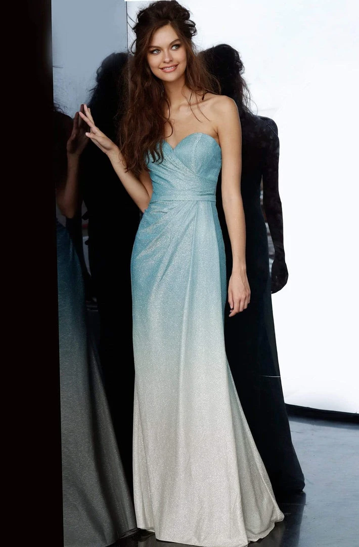 Be mesmerized by the spectacular elegance of this Jovani JVN01015 creation. Gorgeously draped with asymmetrical pleats on a shimmer ombre fabric, this gown flaunts a strapless sweetheart neckline with a low scooped back. Nipped with a slim waistband, the sheath skirt is beautifully draped as it flows into a full-length hemline and brush of train. Be at the front and center of the limelight in this Jovani masterpiece. Model is wearing the Blue/Gold color.