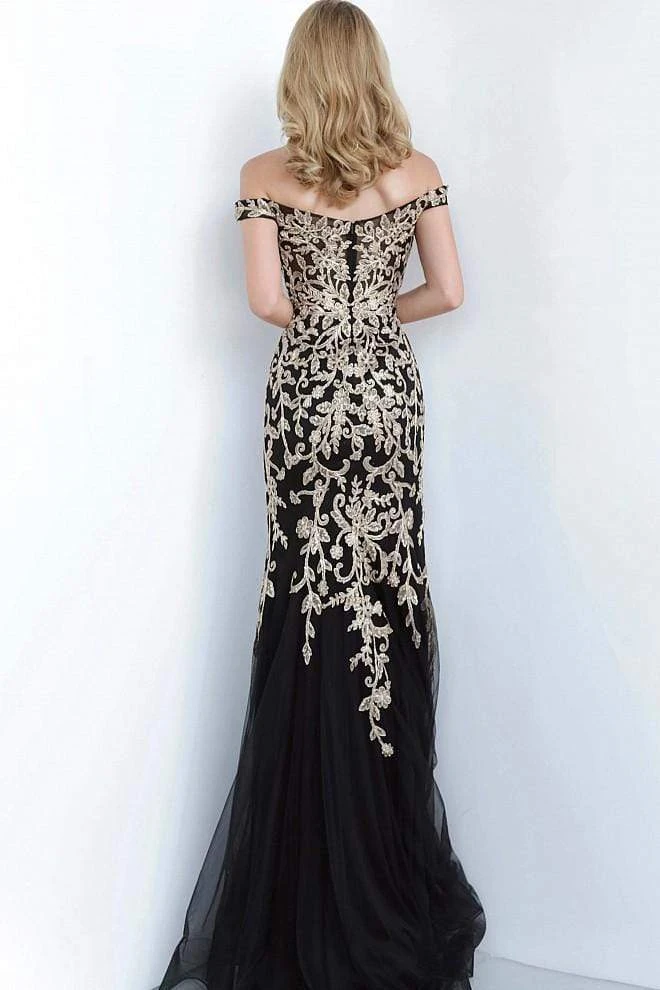 The night is yours in a spectacular gown from Jovani JVN3907 design. Stunning lace appliques beautify the fitted bodice and drenches to the top skirt of the mermaid silhouette. An off-shoulder neckline crowns the fitted bodice as fabulous pleats adorn the mermaid skirt, completed with horsehair hemline and brush train. You will stand out immediately in a wonderful piece from Jovani creation. Model is wearing Black/Gold color.
