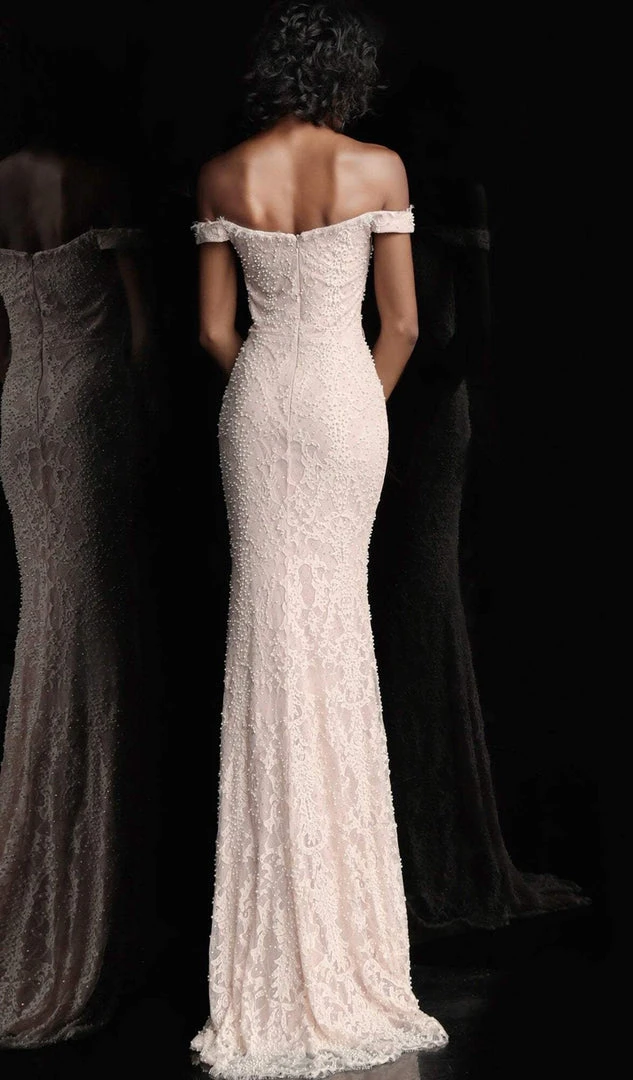 Show off your feminine side in this long evening dress from Jovani JVN66695. This lace dress flashes in an off the shoulder neckline with a form-fitting bodice. The skirt has a trumpet silhouette that heightens your curves and finishes the look in a mini train. The night is yours in a spectacular gown from Jovani.