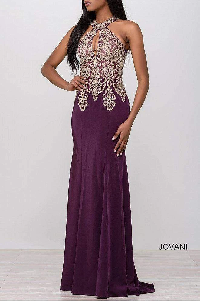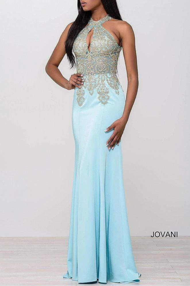 This elegant prom dress from  Jovani JVN33691 will make you the epitome of grace and elegance. This floor-length jersey dress features a halter neckline with a keyhole opening and intricate gold thread embroidery atop a black sheer mesh that ends right above the natural waistline. The form-fitting skirt is fully lined with a stretch jersey underlay. This sleeveless dress will fit and flatter every shape while the twin seams running down the skirt will create an elongating figure. Available in six different colors, you are sure to shine the brightest on your special nights wearing Black color.