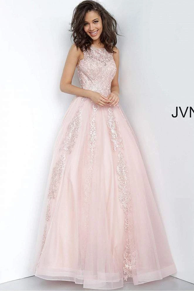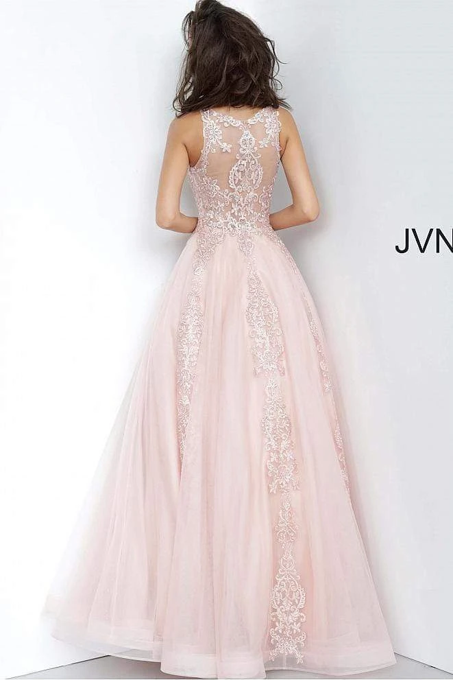 The fitted bodice boats a jewel neckline with sleeveless cut and sheer back panel. Stunning embellishments adorn the bodice and tulle crafted A-line skirt. This dress is floor length finished in horsehair hem.