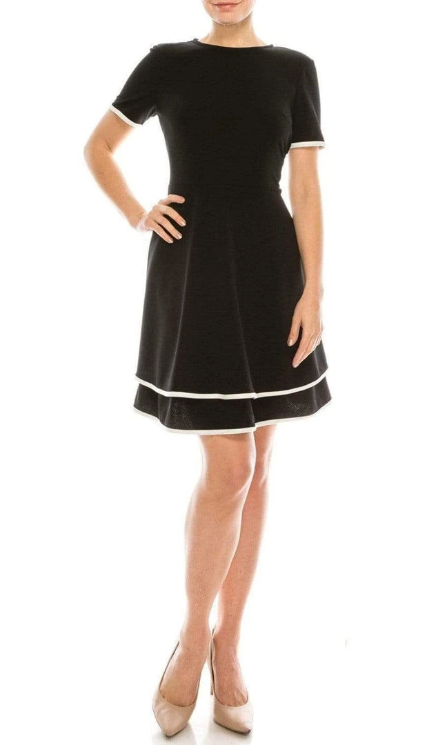 Glamour gets gorgeous with this beautiful dress from London Times T4830M. The fitted bodice showcases a jewel neckline and short sleeves, complemented with a full zipped up back. This dress has ivory piping the sleeves and on its tiered a-line skirt. Create a perfect evening with this London Times dress.