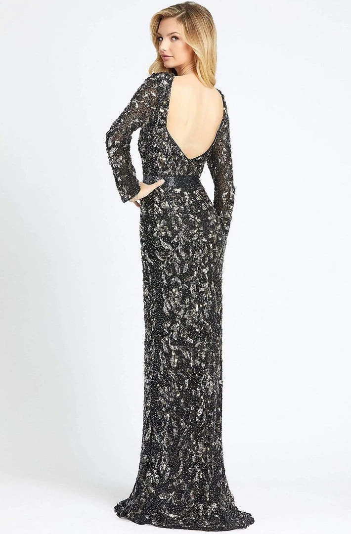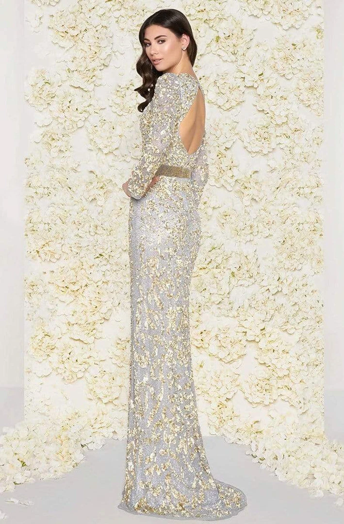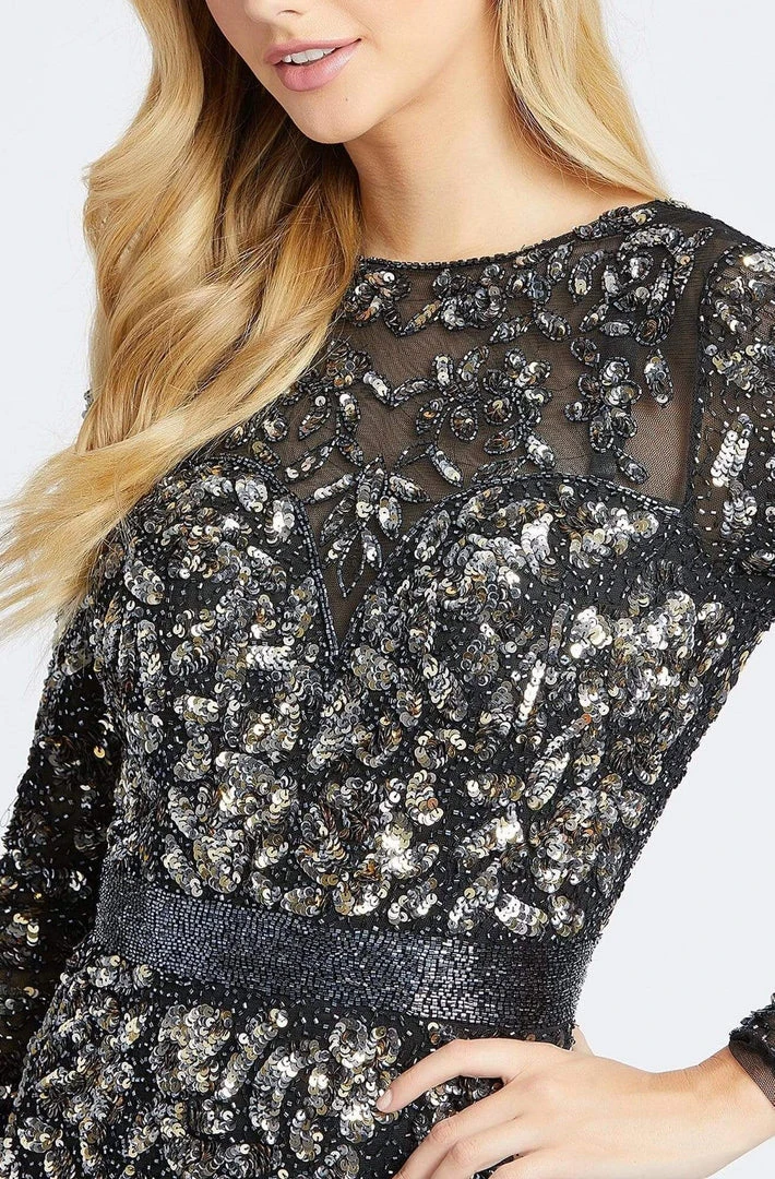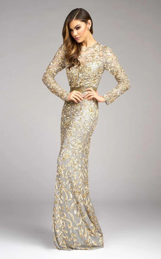 Light up the ballroom at your black-tie event with pure luminous grace in this elegant Mac Duggal Couture 4316D creation. Designed with a trailing vine embellishments festooned in glistening sequins and beads on meshed lace, this beauty shows off a jewel illusion over a sweetheart neckline with slim long sleeves. With a circular open back, this stunner is handsomely cinched with a wide glimmering band. Exceptional sheath skirt in lace flows down divinely to complete at a full-length hem and a subtle brush of train. Showcase your inner brilliance and alluring style in this glamorous Mac Duggal masterpiece. Model is wearing the Platinum/Gold color.