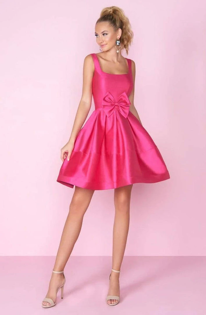 Fashionable and fun, this vintage-inspired cocktail dress by Mac Duggal After 5 66571C. The fitted bodice is sleeveless with square neckline. The back is defined with a scoop shape and is enclosed with a center zipper while the waistline is adorned with a bow. The short skirt flares to a fashionable finish. This dress by Mac Duggal is the perfect style for twirling on the dancefloor. Find more christmas party dresses!