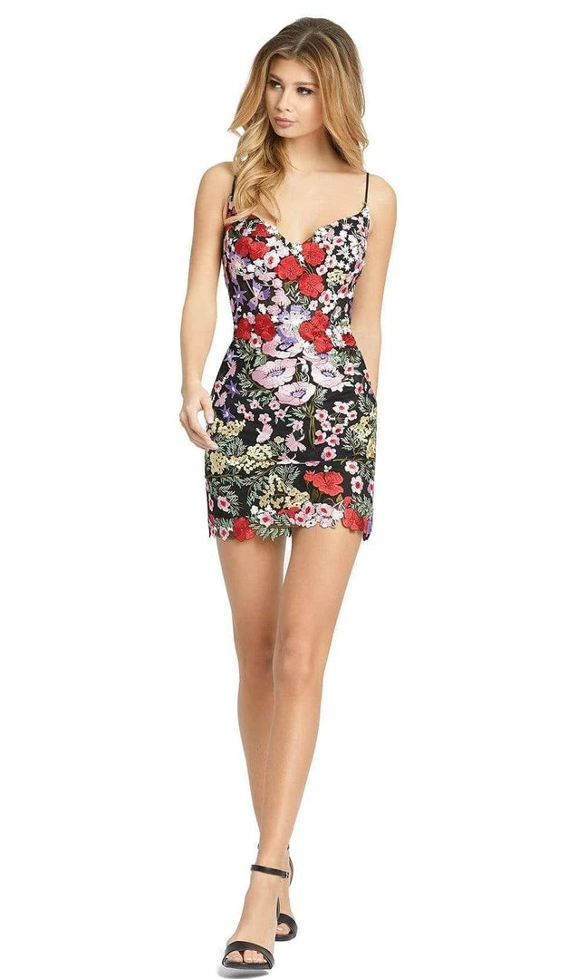 Be the delight of everyone’s eyes in Mac Duggal 67459. Show your sexy and seductive look while wearing this floral print dress that features a v-neck neckline and sleeveless spaghetti straps. This short length dress has an open back with a lace tie as a closure. Look sophisticated and mature in this simple yet chic evening dress by Mac Duggal.