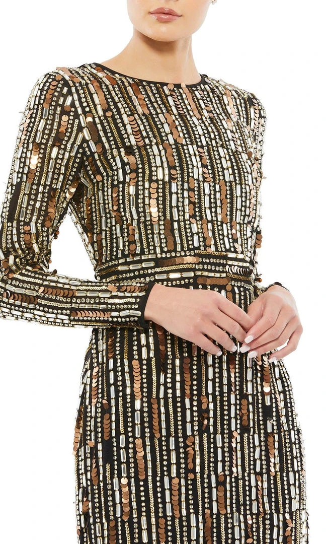 Create an impact when you walk in in this exquisite Mac Duggal 93590 creation. Gleaming with an array of stripe rendered iridescent sequins, this long sleeve dress impresses with a jewel neckline and a full back. Accented with trailing embellishments, the sheath skirt sculpts into a tea length hemline. Expect to be turning heads as you walk by in this Mac Duggal masterpiece. Exquisite attention to detail is the hallmark of Mac Duggal dresses. Mac Duggal dresses encapsulate the very essence of the women who wear them, reflecting their confidence, feminine power, and inner beauty.