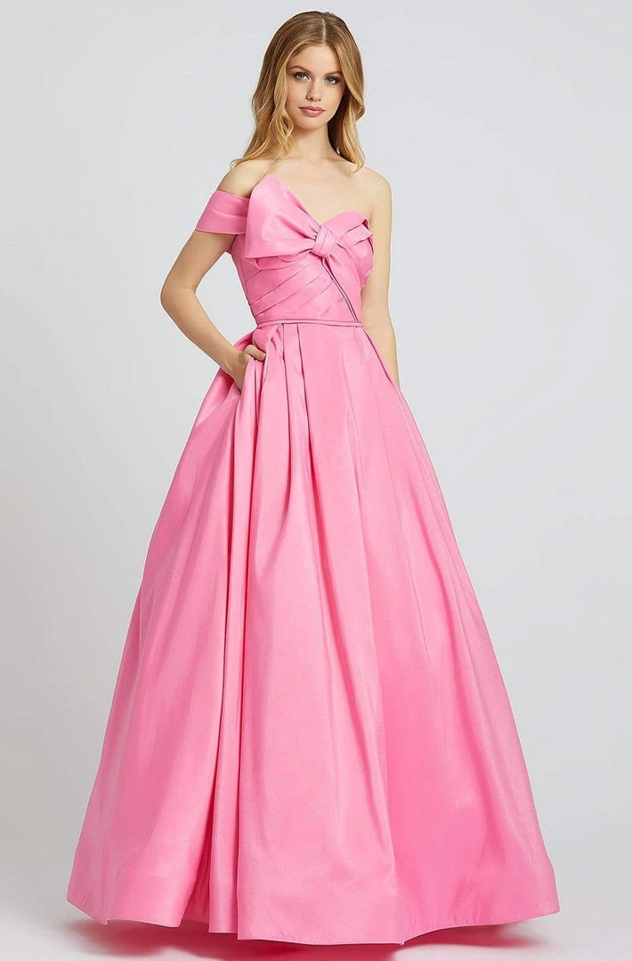 Turn yourself into a head-turning beauty by slipping into this absolutely eye-catching Mac Duggal Ballgowns 48863 piece. The whole ensemble is designed in pleats as the fitted bodice features a sweetheart neckline, with a big bow accent and single shoulder strap. The skirt parades a ballgown silhouette also adorned with pleats and side pockets which falls to a full length hemline. The back is mid-open secured with a center zipper closure. Fascinate them all wearing this exceptional Mac Duggal creation.