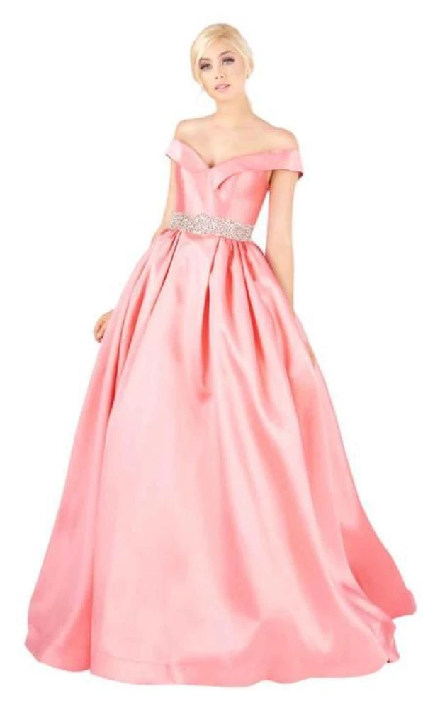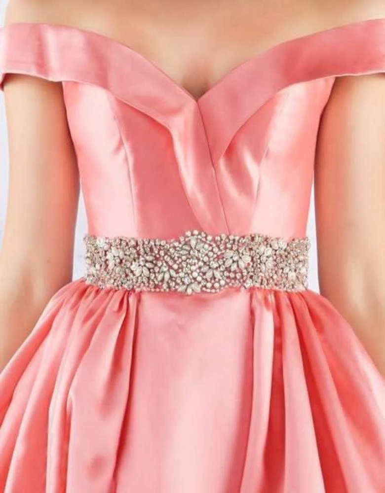 | Details: | Folded Off shoulder neckline, Cap sleeves, Princess seams, Embellished Belt, Back zipper closure |