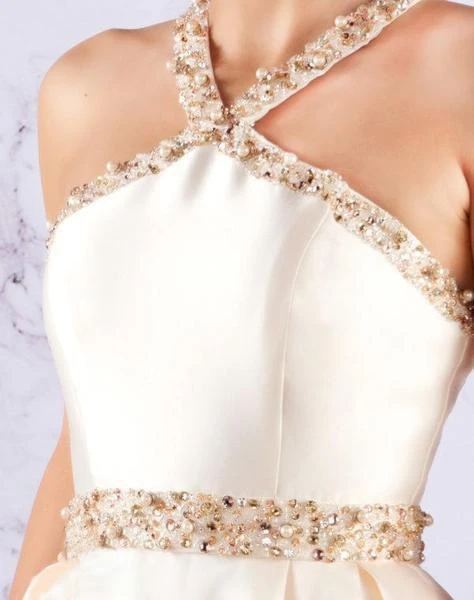 Exude a timeless appeal in this elegantly ornate Mac Duggal Ballgowns 77498 masterpiece. Mesmerizes in a sleeveless, halter neckline accented with pearl beading. Fitted bodice is wrapped in an embellished belt and flaunts a diamond open back. The pleated ballgown skirt is detailed with side pockets and finishes the look in a sweep train. Turn yourself into a head-turning beauty by slipping into this absolutely eye-catching Mac Duggal gown.