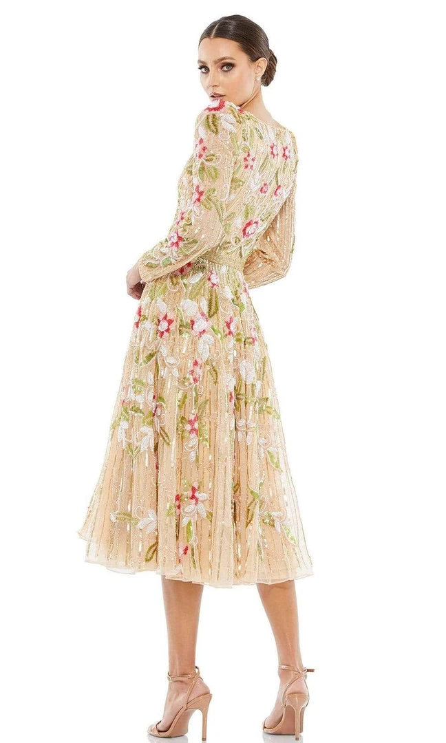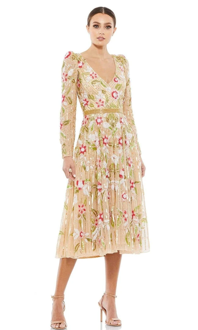 Be ready to fascinate everyone in this Mac Duggal 5415 dress. This dress showcases a V-neckline supported by long sleeves in a sequin embellished bodice. The skirt reveals an A-line silhouette while the back shows a full back with back zipper closure. Be fabulous in this Mac Duggal creation. Model is wearing Gold and Multi-Color.