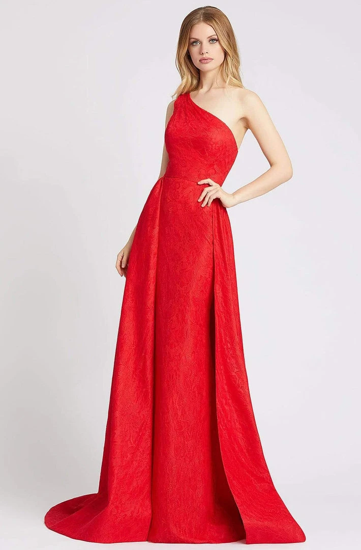 Look amazing for the party in this design by Mac Duggal Flash 12363. This lace gown mesmerizes in a sleeveless, asymmetric neckline with fitted bodice styled with a back zipper. The skirt forms a fitted silhouette and is complemented with an overskirt with a train finish. Show your sophisticated sense of style in this Mac Duggal look.