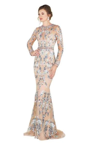 This graceful dress allures in a jewel neckline with sheer long sleeves. The floral embroidered dress has a fitted bodice and is cinched in a beaded belt. The skirt has a trumpet silhouette that runs at full length hem to a sweep train finish.