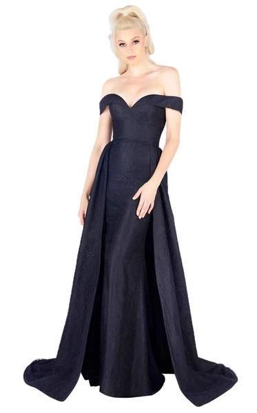 Sculpted from a taffeta fabric with an ethereal lace overlay, this alluring piece shows an off shoulder neckline with an embracing folded panel and a sweetheart notch. Delicately tailored with a notched mid-open back, the sheath skirt flows to a full-length column, a fluttering A-line overskirt and a sweep train.